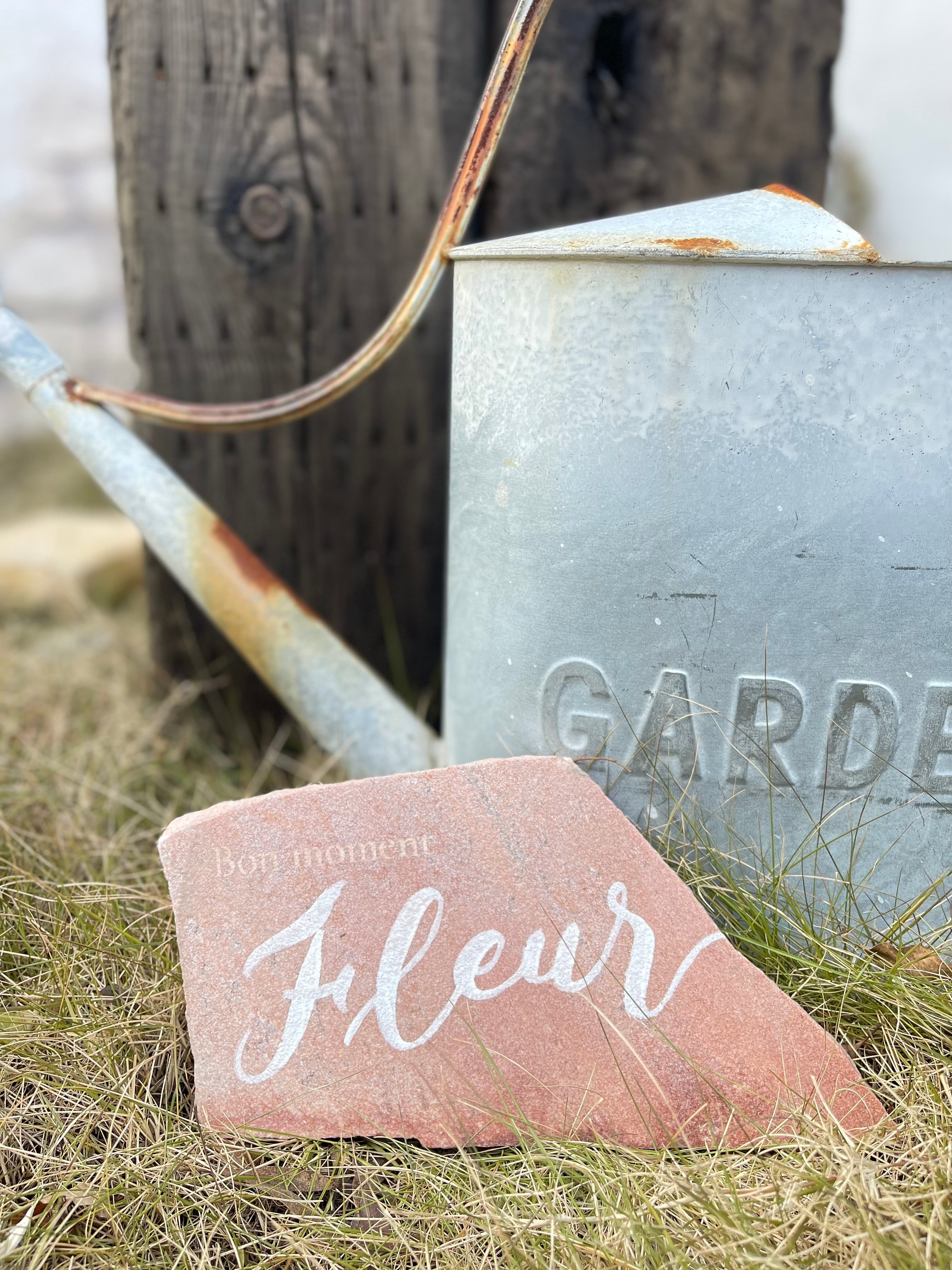 文字入りピンクストーン。乱形石なので、一つ一つ形や大きさが異なり、コパンデガーデンらしいお庭ができます。石の形や色、文字の配置を丁寧に調整し、一つ一つ丁寧に制作しております。